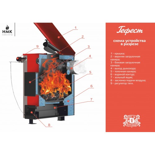Отопительный котел "Гефест" 15 кВт - это стартовый начальный котел в производственной линейке серии "Гефест". Его мощность обусловлена растущими потребностями покупателей в данном рыночном сегменте. Котел "Гефест" 15 кВт - это оптимальное решение для отопление загородного дома площадью до 150 м2. Его можно топить дровами, прессованными брикетами и углем. Котел "Гефест" 15 кВт вобрал в себя все инновации котельного производства, продвинутые технологии отопления и дизайнерский перфекционизм. Данный котел предназначен для установки в системы водяного отопления с естественной или принудительной циркуляцией теплоносителя. Рабочее давление, необходимое для правильной работы котла в системе отопления составляет не более 2 Бар. Также на котел "Гефест" 15 предусмотрена возможность установки автоматического регулятора тяги подачи воздуха и блока ТЭН. Загрузочный герметичный люк, расположенный сверху делает удобным процесс закладки угля в топочную камеру, а специально разработанный конус, предусмотренный в базовой комплектации котла "Гефест" 15 кВт позволяет не просыпать уголь в процессе его засыпки в топочную камеру.