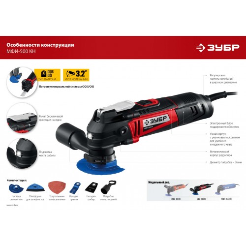 Реноватор ЗУБР - универсальное устройство для специфических работ - выпиливание внутренних отверстий, пиление в труднодоступных местах, тонкое шлифование малогабаритных деталей. Большой угол колебаний 3.2 градуса в сочетании с широким спектром регулировки частоты обеспечивают эффективную работу с любым материалом. Расширенная комплектация включает в себя базовый набор насадок для начала работы сразу после покупки и удобный кейс для хранения и переноски. Применяется для резки, пилки, шлифовки заготовок из дерева, металла, керамики, пластика и т.д. Многофункциональное изделие с мощным двигателем способно выполнить любую работу. Тонкий корпус и эргономичный дизайн, благодаря чему инструмент удобно лежит в руке. Патрон универсальной системы с бесключевой фиксацией для насадок с хвостовиком OQIS / OIS. Угол колебаний 3.2 градуса увеличивает производительность изделия. Электронная регулировка частоты колебаний позволяет подобрать оптимальный режим для каждого вида работы и материалов. Поддержание постоянной частоты колебаний для эффективной работы при любой нагрузке. Подсветка для работы в условиях ограниченного освещения. Комплект наиболее востребованных насадок для начала работы сразу после покупки. Кабель длиной 3 метра увеличивает дальность работы от розетки. Мягкие накладки на корпусе позволяют надежно удерживать изделие в работе при любом хвате. Фирменный удобный кейс для хранения и переноски.
